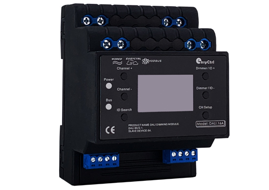 系統調關執行單元,一般安裝在配電箱內,導軌式安裝,占4個模數位,內置DALI電源,具有單條DALI總線,最多支持64個DALI驅動的LED燈,最多可分為16回路組控制,實現燈光明暗調節,開關控制,支持YC-BUS總線/RS485控制;
