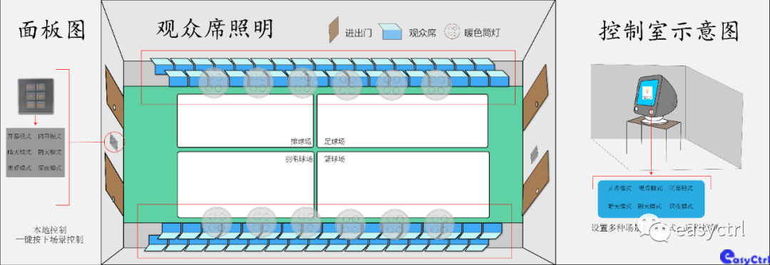 ●布線分析,體育館大致劃分為主賽場(chǎng)、觀眾席、公共通道、休息室、停車場(chǎng),在傳統(tǒng)的體育館照明回路是從斷路器接到開關(guān)再到燈具上的,而斷路器在每個(gè)區(qū)域裝配電箱內(nèi)控制。