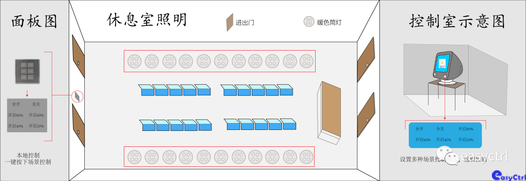 在公共區(qū)域通過場(chǎng)景控制,面板按照設(shè)定好的場(chǎng)景進(jìn)行控制,可以定義任意組合的燈開關(guān),比如設(shè)定按鍵1為一鍵全開全關(guān),按下即可執(zhí)行。